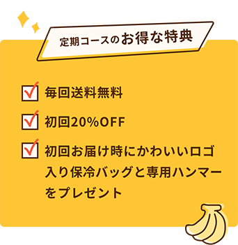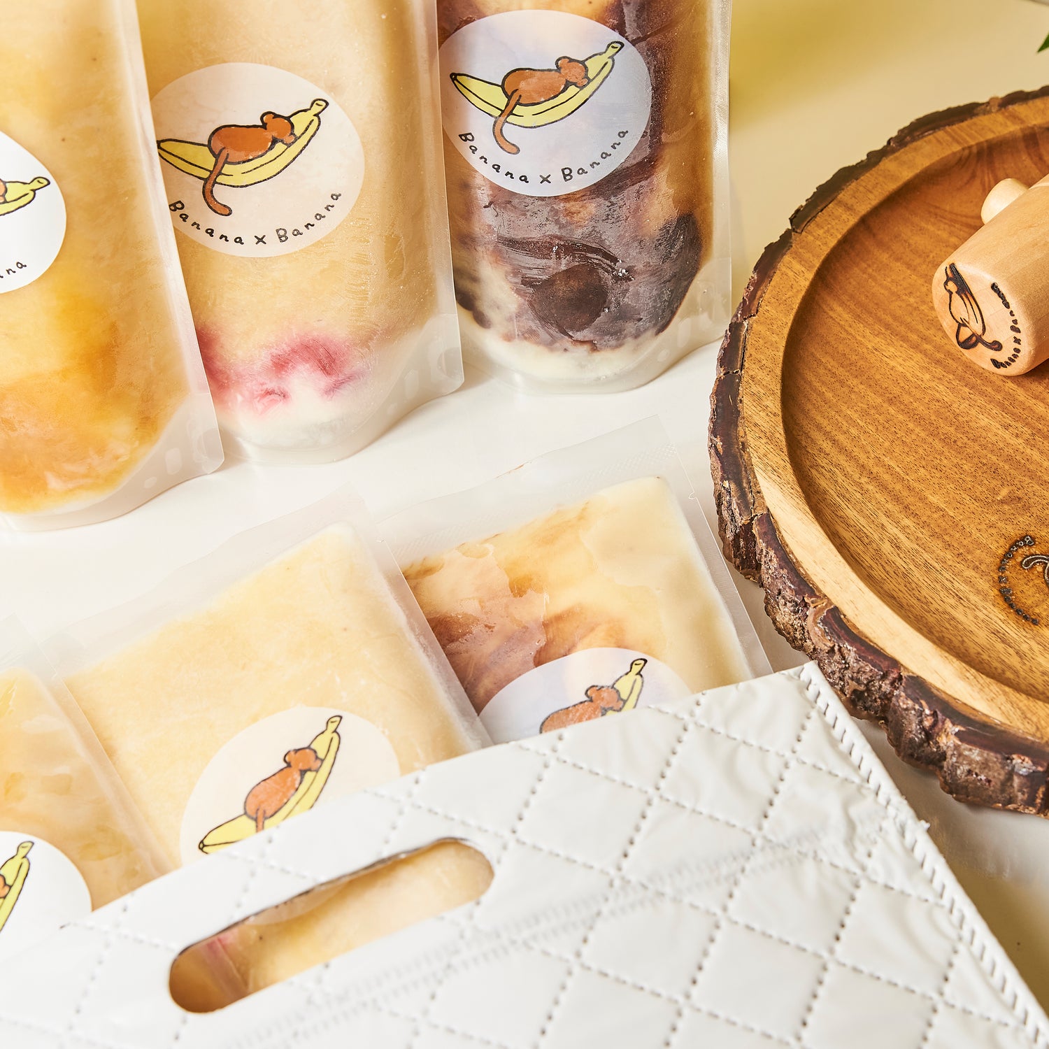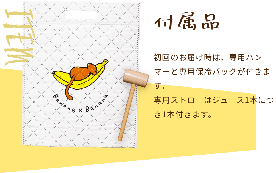 特注のフィルムケースを使用しているので、思いっきり叩いても破れません。バナナが均等に潰れるまでハンマーでしっかりと叩いてください。 -
